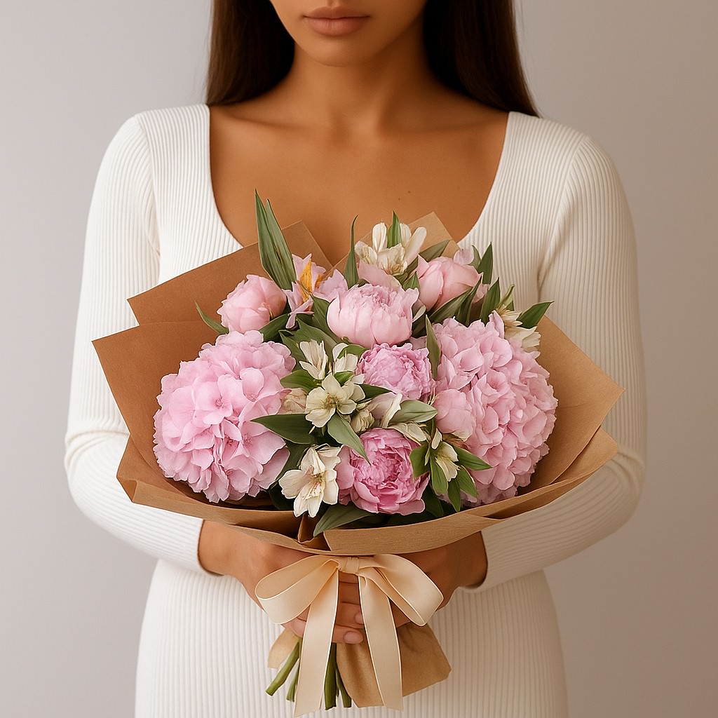 Очаровательный букет в нежно-розовых тонах, наполненный воздушностью и свежестью. Пышные гортензии и ароматные пионы создают мягкий и объёмный акцент, а изящные альстромерии добавляют лёгкость и гармонию. Этот букет станет прекрасным подарком для выражения нежных чувств и создания праздничного настроения.