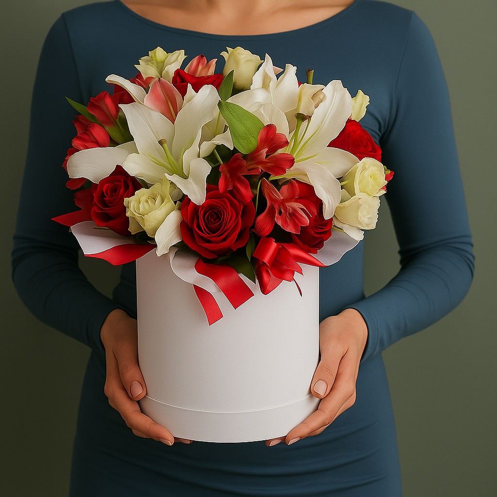Яркая цветочная композиция, в которой благородные лилии сочетаются с алыми розами. Символ страсти и нежности одновременно.